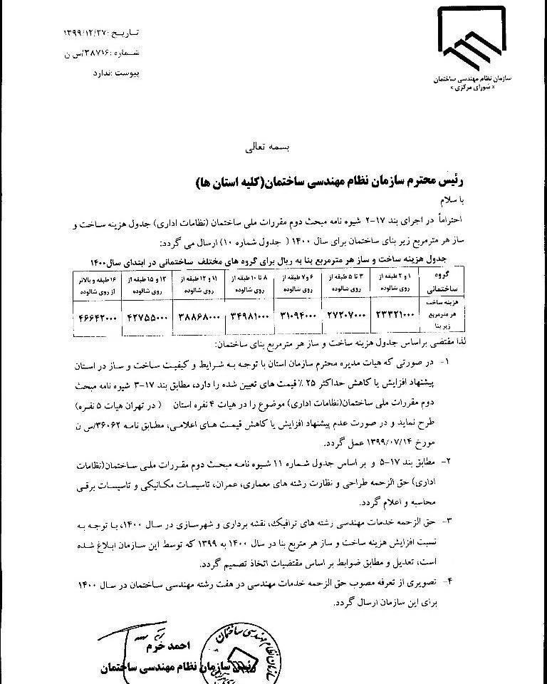 بر اساس این ابلاغیه، هزینه ساخت هر متر واحد مسکونی یا غیر آن در سراسر کشور برای سال جاری (۱۴۰۰) به شرح زیر است: