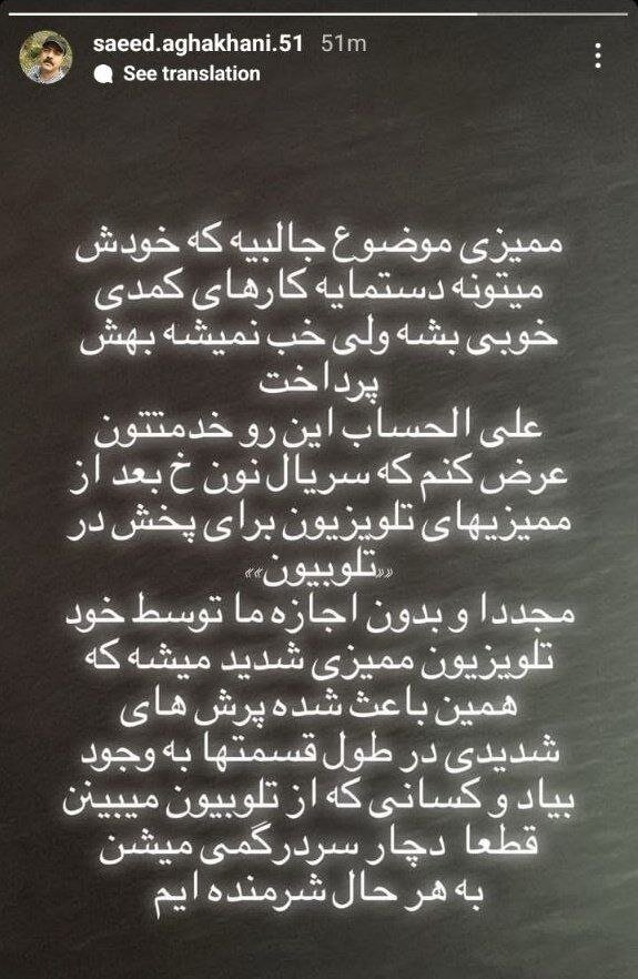 سعید آقاخانی، بازیگر و کارگردان شناختهشده که در ایام نوروز با فصل چهارم «نون خ» روی آنتن تلویزیون بود در یک استوری اینستاگرامی از ممیزیهای صورت گرفته در مورد این سریال برای پخش از تلوبیون (مرجع پخش زنده و آرشیو برنامههای صداوسیما) انتقاد کرد.