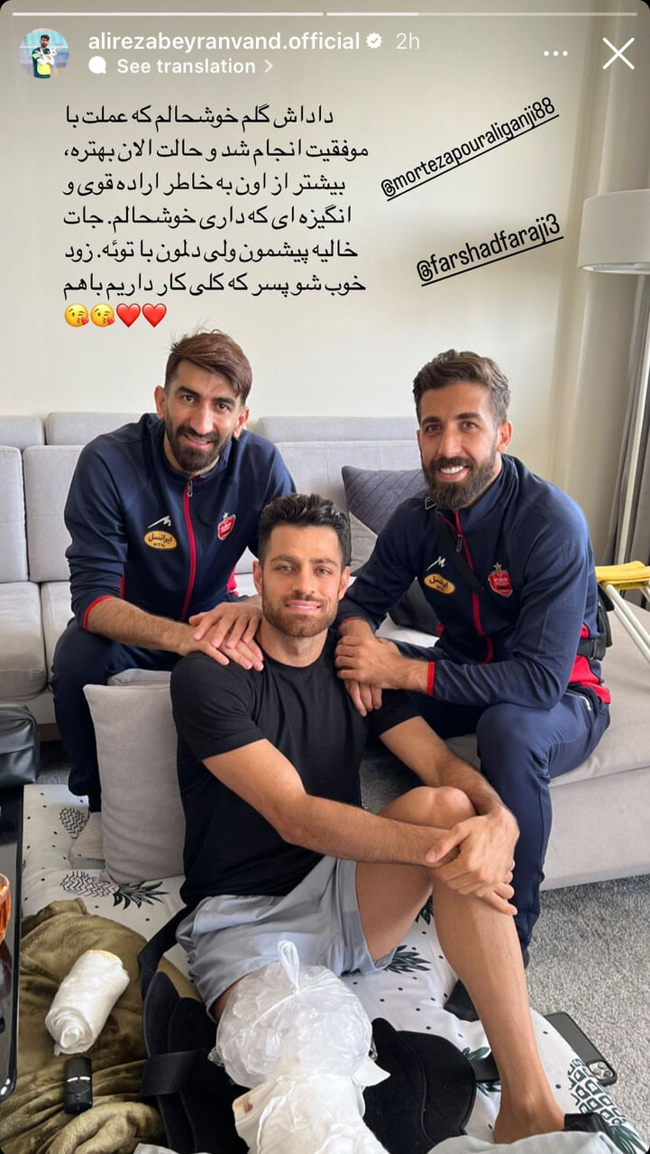 علیرضا بیرانوند، دروازهبان پرسپولیس که رفاقت نزدیکی با پورعلیگنجی دارد همراه با فرشاد فرجی به عیادت او رفت و با انتشار یک استوری به مدافع پرسپولیس روحیه داد.