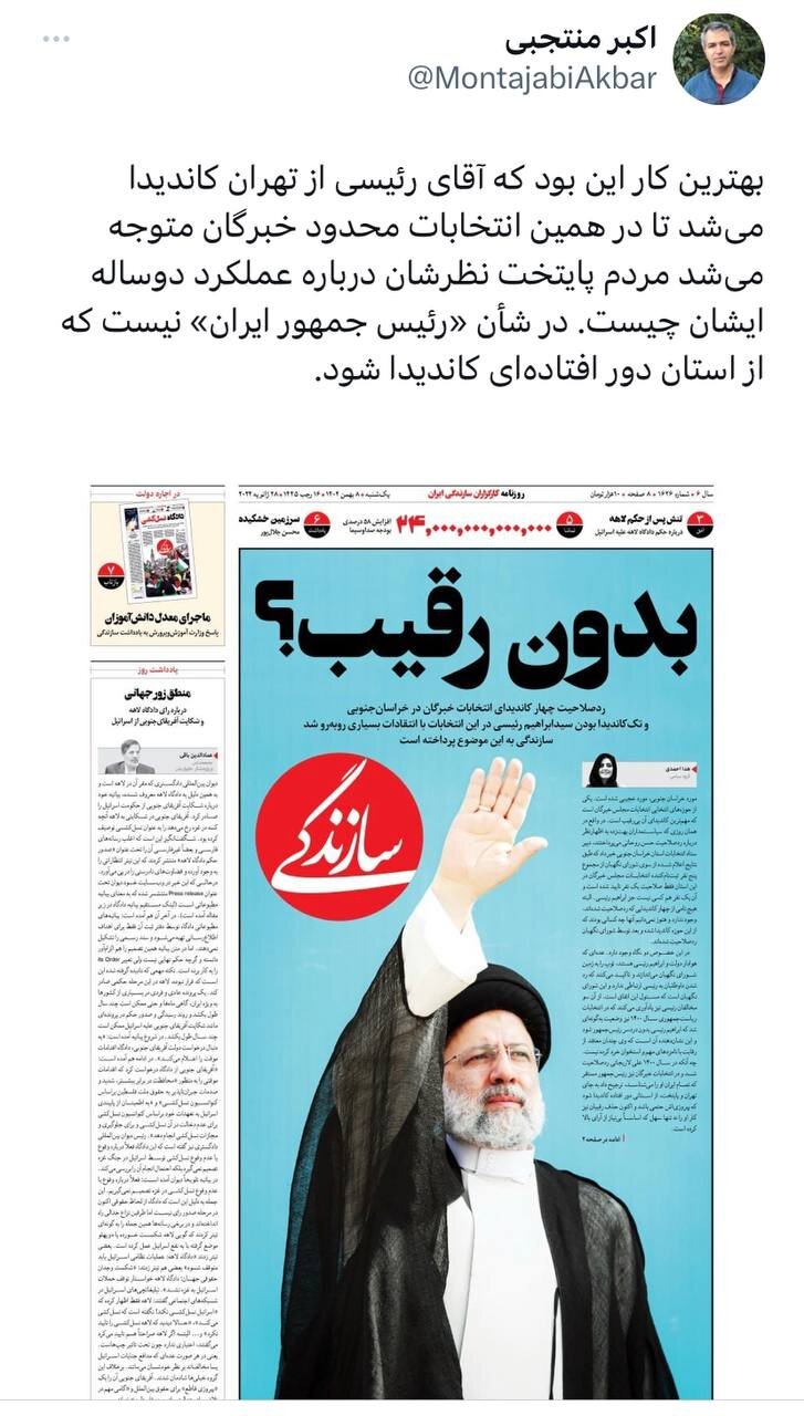 به گزارش سایت خبری پرسون، اکبر منتجبی فعال رسانه ای، در واکنش به جنجال کاندیداتوری ابراهیم رئیسی از استان خراسان جنوبی برای انتخابات مجلس خبرگان رهبری، در شبکه اجتماعی ایکس نوشت: