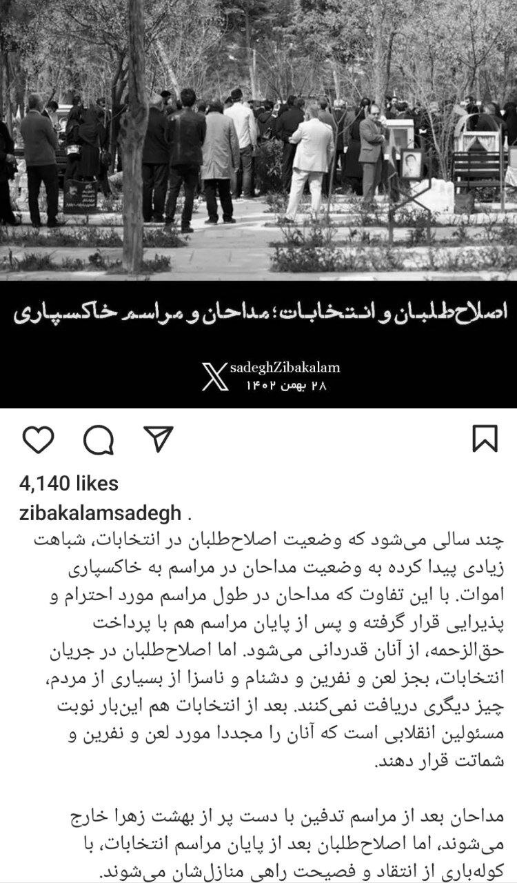به گزارش سایت خبری پرسون، صادق زیباکلام، استاد علوم سیاسی، در اینستاگرام خود نوشت: «چند سالی میشود که وضعیت اصلاحطلبان در انتخابات، شباهت زیادی پیدا کرده به وضعیت مداحان در مراسم به خاکسپاری اموات. با این تفاوت که مداحان در طول مراسم مورد احترام و پذیرایی قرار گرفته و پس از پایان مراسم هم با پرداخت حقالزحمه، از آنان قدردانی میشود.