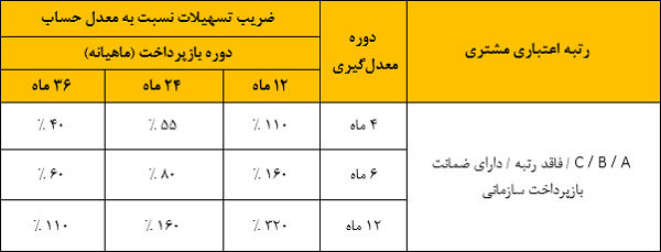 شایان ذکر است، دوره معدلگیری این تسهیلات از ۴ تا ۱۲ ماه و دوره بازپرداخت آن از ۱ تا ۳ سال تعیین شده و امتیاز آن برای اشخاص حقیقی قابل انتقال به نزدیکان شامل همسر، فرزندان، والدین، برادر و خواهر و برای اشخاص حقوقی قابل انتقال به پرسنل بیمه شده که حقوق آنها از طریق بانک ملت واریز می شود، است.