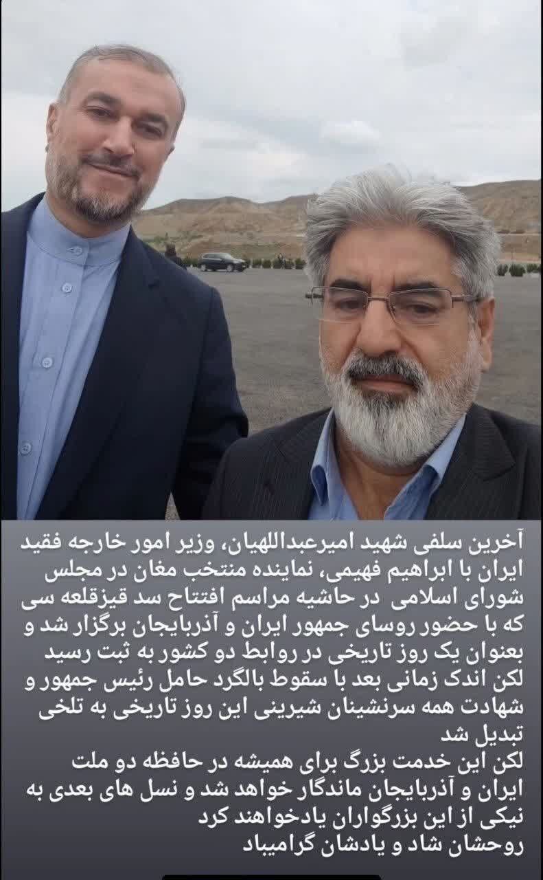 به گزارش سایت خبری پرسون، ابراهیم فهیمی گیگلو نماینده منتخب شهرستانهای پارسآباد، بیلهسوار و اصلاندوز در مجلس دوازدهم در آخرین ساعات پیش از پرواز بالگرد حامل ابراهیم رئیسی و همراهانش، عکس سلفی با شهید حسین امیرعبدالهیان، وزیر امور خارجه فقید در سد قیز قلعه سی خداآفرین ثبت کرد؛ این عکس را مشاهده میکنید.