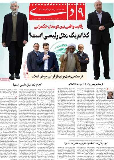 سؤال اینجاست که هفته نامهای[۹دی متعلق به حمید رسایی] که تصویر دو نامزد از یک جبهه (جبهه انقلاب) را در صفحه اول خود منتشر میکند و با القا، مخاطبان را دچار این تشویش ذهنی میکند که در انتخاب، مردد بین این و آن باشند و بدتر اینکه یکی را «دیو» و دیگری را «دلبر» تلقی کنند، کجای رفتارش تشکیلاتی عمل کردن در چارچوب یک جبهه است؟ طبیعی است که رقیب نامزدهای این جبهه در جبهه مقابل، با صف آرایی و کار تشکیلاتی منسجم، چه بسا با وجود عده کمتر میدانی در پای صندوق رأی، سرنوشت دیگری را برای انتخابات رقم بزند.